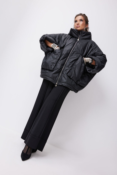 Комплект женский, состоящий из куртки и брюк. Куртка оверсайз с цельнокроеным рукавом, заканчивающимся широкой притачной манжетой. Куртка с капюшоном переходящим в воротник-стойку. Куртка с застежкой на тесьму молнию и ветрозащитным клапаном. По спинке - кокетка. Перед куртки с кокеткой и большими накладными карманами типа "портфель" и фигурными клапанами с застегивающимися на кнопку. Низ куртки с потайной кулисой для возможности регулировки объема. Брюки из трикотажного полотна, прямого силуэта. Пояс притачной, на резинке. По переду карманы. Вертикальные рельефы и открытые срезы по переду и спинке. По низу брюк притачная манжета с открытым срезом.