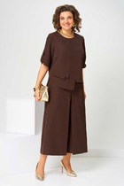 Костюм женский, состоящий из туники и брюк. Туника прямого силуэта, по спинке воротник притачная стойка, а по переду цельнокроеная стойка, линия плеча спущена, рукав втачной, заканчивающийся манжетой с открытым срезом из отделочной ткани. По разрезу и низу туники притачная планка с открытым срезом из отделочной ткани. По переду настрачной декоративный элемент. Брюки прямого силуэта типа "палаццо", по передней части боковые карманы, пояс притачной с резинкой по кругу.