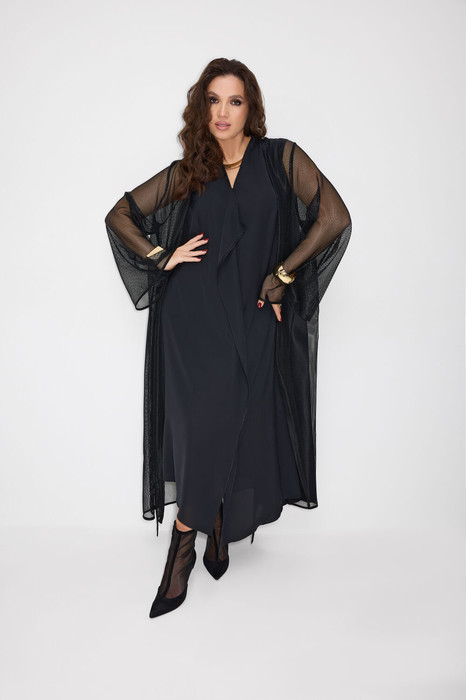 Комплект женский, состоящий  из платья и кардигана. Платье А-образного силуэта, на подкладке. По переду средний шов, переходящий в волан с разрезом. По спинке средний шов с окантованным  разрезом, со шнурками. В боковых швах карманы и окантованные разрезы со шнурками. Воротник по спинке - цельнокроеная стойка, переходящая в V-образный вырез по переду. Низ изделия разноуровневый, фигурный. Кардиган А-образного силуэта. Выполнен из сетки. Рукав втачной, длинный, расширенный. В комплекте украшение - брошь.