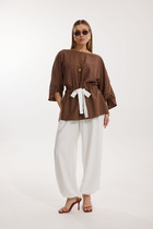 Размер 46: Туника: ОГ-116, ОТ-116, ОБ-116, ширина плеча-23,5, длина рукава втачного-44, ширина рукава на уровне низа-20, длина изделия спинки по центру-57. Брюки: ОТ в собр.-72, ОТ  в раст.-82, ОБ-100, ширина изделия по низу-30, длина изделия по боковому шву с поясом-109.