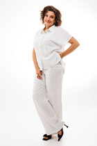 Комплект: блузка + юбка. Комплект выполнен из трикотажного полотна с люрексом. Блузка приталенного силуэта длиной до линии талии. Спереди средний шов с застежкой на потайную молнию, перекрут со сборками по боковыми швам. Спинка цельная. Рукав втачной одношовный, длиной до линии локтя. Блузка с плечевыми накладками, на подкладке. Юбка длиной макси, зауженная к низу. Переднее и заднее полотнища цельные. В левом боковом шве разрез. Юбка на цельнокроеном поясе. Юбка без подкладки.