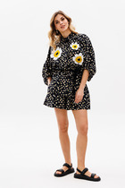 Комплект: блузка + шорты. Комплект выполнен из плательной ткани с принтом. Блузка прямого силуэта, свободного покроя "кимоно". Спереди застежка с потайной планкой на пуговицы. Горловина округлой формы, стояче-отложной воротник с отрезной стойкой. Рукав цельнокроеный, двухшовный, длиной ниже линии локтя, расширенный к низу. Низ обработан бейкой. Низ блузки фигурной формы. Перед декорирован аппликацией в виде цветов. Шорты прямого покроя, на притачном поясе с эластичной тесьмой, в боковых швах обработаны карманы. В комплект входит съемный пояс в виде шнура.