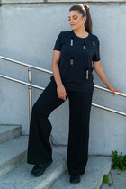 Комплект: джемпер + брюки. Комплект выполнен из трикотажного полотна. Джемпер прямого силуэта, длиной до линии бедра. Перед и спинка цельные. Горловина округлой формы, обработана широкой бейкой. Плечевой шов удлинен. Рукав рубашечного покроя, одношовный. Брюки прямого покроя, длиной в пол, на притачном поясе с эластиной тесьмой.