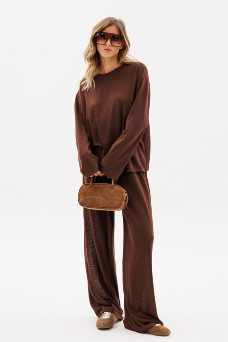 Комплект: джемпер + брюки. Комплект выполнен из трикотажного полотна. Джемпер прямого силуэта, длиной до линии бедра. Перед и спинка цельные. Горловина округлой формы, обработана широкой бейкой. Плечевой шов удлинен. Рукав рубашечного покроя, одношовный. Брюки прямого покроя, длиной в пол, на притачном поясе с эластиной тесьмой.