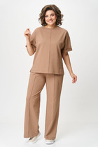 Костюм свободного прилегания выполнен из мягкой немнущейся ткани. Блузон с капюшоном и цельнокроеным рукавом по низу которого кулиса с завязками. По полочки блузона выполнен карманы "рамки", низ блузона затягивается на кулису. Брюки- шаровары на притачном поясе с резинкой, по боковым брюк карманы. низ брюк на кулисе. Декорированы брюки густой дизайнерской вышивкой "кошка" Длина брюк 100 см. длина блузона-62 см.