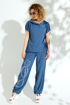 Костюм свободного прилегания выполнен из мягкой немнущейся ткани. Блузон с капюшоном и цельнокроеным рукавом по низу которого кулиска с завязками. По полочки блузона выполнен карманы "рамки", низ блузона затягивается на кулиску. Брюки- шаровары на притачном поясе с резинкой, по боковым брюк карманы. низ брюк на кулиске. Декорированы брюки густой дизайнерской вышивкой "кошка"
