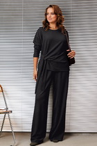Костюм женский 2х предметный состоит из жакета и брюк. Жакет прилегающего кроя, по полочке жакета расположены прорезные карманы с клапанами. Горловина - отложной воротник с лацканами. Рукав втачной длинный.  Застежка петля-пуговица. Брюки прямого кроя с высокой посадкой, на притачном поясе со вставками эластичной тесьмы.  в боковых швах брюк -палаццо имеются карманы. Застежка  молния на гульфике, петля-пуговица. Жакет без подкладки.