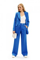 Костюм женский состоящий из жилета и брюк (брюки-юбка). Жилет выполнена из сочетания тканей: трикотажное полотно с пойетками по полочке, спинка из органзы. Горловина V-образная, п полочке горловины ассиметрично расположен декоративный волан из органзы. Спинка с декоративной вставкой из органзы, застежка потайные кнопки, Полочка жилета с подкладкой. Брюки выполнены из гладкой костюмной ткани расширенные к низу. Брюки с завышенной посадкой на притачном поясе с резинкой, в Боковых швах расположены карманы.