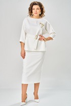 Костюм женский двойка с брюками клеш из джинса. Костюм состоит из блузона и брюк, блузон свободного кроя асимметричный, перед асимметричный с V-образным вырезом и отложным лацканом, рукав втачной 3/4 с широкой манжетой по низу. Спинка изделия разрезная с кокеткой. Брюки клеш с небольшим расширением низу, с завышенной посадкой на притачном поясе, в боковых швах расположены карманы, застежки молния на гульфике и петля пуговица на поясе.