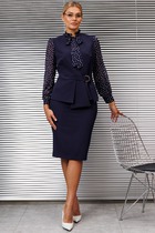 Костюм из трикотажного вискозного полотна в комбинации двух видов в единой цветовой гамме: гладкокрашеного и с набивным рисунком, состоящий из туники и леггинсов. Туника – из полотна с набивным рисунком, свободного покроя, слегка расширенная книзу, с короткими втачными рукавами, горловиной овальной формы, обработанной притачной бейкой, и фигурной линией низа. Рукава с притачными манжетами. Планка горловины и манжеты выполнены из отделочного материала. Леггинсы – из гладкокрашеного полотна, прилегающие к телу, с эластичной тесьмой по талии.