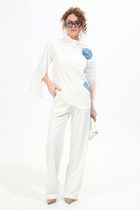 Комплект 2-х предметный, состоящий из блузона и юбки. Блуза без воротника с круглым вырезом горловины и центральной застёжкой на пуговицы, декорирована притачным воланом. Рукав  и спинка с декоративным разрезом. Юбка прямая с притачным поясом  и застежкой по центру спинки на молнию. По низу юбки притачной волан, по среднему шву спинки разрез. Длина блузон по спинке 54 см. Длина рукава 31 см. Длина юбки 70 см.
