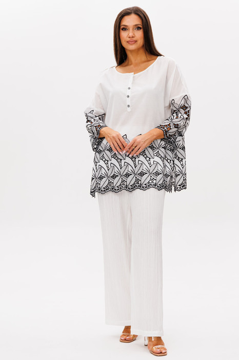 Свободная блуза-туника из хлопчатобумажного батиста с контрастной вышивкой. Рубашечный покрой, круглая расширенная горловина, частичная застежка в верхней части полочки, рукав длины 3/4.