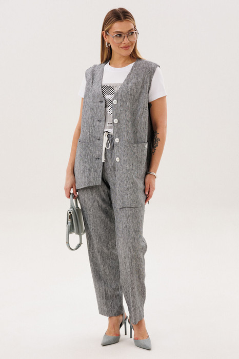 Стильный и актуальный образ - жилет на базовую футболку плюс брюки в расслабленном стиле. Практичный и удобный - это лучший вариант для летней жары. Свободный жилет, который можно носить и без футболки, удлиненный с разноуровневым ассиметричным низом, удлиненной спинкой, боковыми разрезами и карманами в швах.