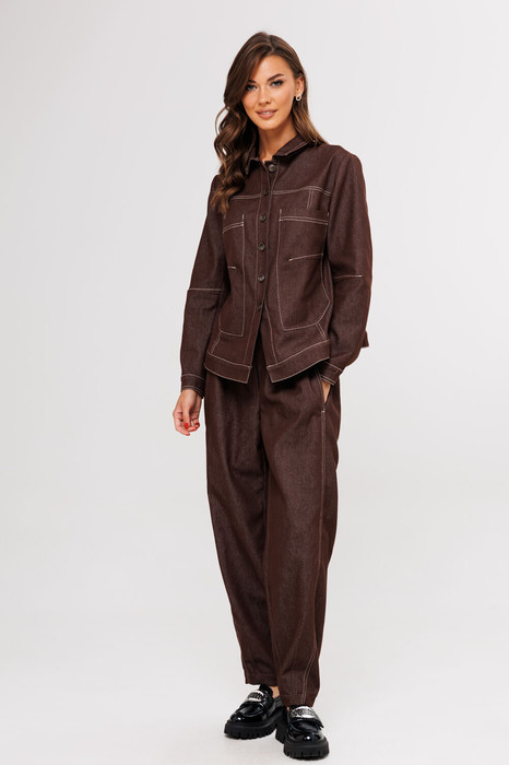 Жакет-рубашка полуприлегающего силуэта, втачного покроя с центральной фигурной застежкой на отрезной планке, втачным двухшовным рукавом на манжете и притачном поясом по низу, создающим слегка расширенную линию, имитирующую легкую баску. Полочка с отрезной кокеткой, вертикальным рельефом и фигурным накладным карманом нестандартной формы.