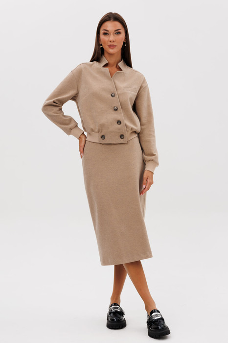 Женские костюмы уже давно стали ответом на вопросы стиля. Костюм - это уже готовый завершенный образ. Один из модных трендов сезона - сочетание юбки длинны миди и укороченного жакета. Модная расцветка, свободный покрой с заниженной линией плеча, воротник - стойка, переходящая в фигурную линию борта. Застежка - двубортная на пуговицы. По низу жакета и рукавов - трикотажный эластичный довяз. Юбка прямая, на передних половинках боковые наклонные карманы. На задних половинках кокетки и накладные карманы в направлении под углом 45 градусов и высокая шлица.