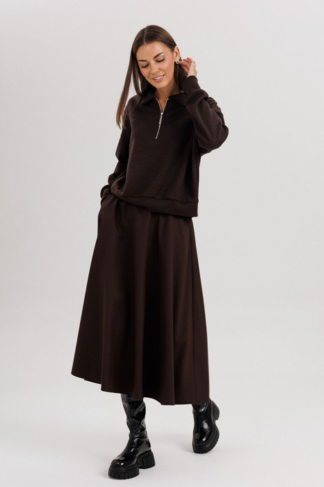 Джемпер из трикотажа. Это одна из базовых вещей осенне-зимнего сезона. Он тёплый, удобный и невероятно комфортный. К тому же, настолько универсален, что его можно стилизовать абсолютно разными способами. Свободный покрой с заниженной линией плеча, рукав рубашечного покроя на отрезной манжете, воротник классический, по центру полочки частичная застёжка-молния. По низу джемпера - отрезной пояс. Юбка коническая, длины миди на притачном поясе, частично эластичном в области спинки. По боковым швам - наклонные карманы, застёжка по центру заднего полотнища на тесьму-молнию и петлю пуговицу. Пояс в комплект не вхолит. Длина юбки около 72 см