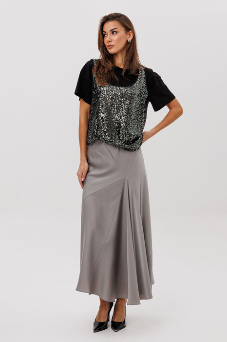 Тройка, созданная для выразительных и стильных образов. Эффектная юбка миди с асимметричными рельефами и конической вставкой из атласного полотна формирует красивую динамику в движении. Мягкая блуза-футболка из комфортного вискозного трикотажа дарит ощущение легкости и идеально балансирует сияние топа. Майка с пайетками добавляет образу яркость и праздничный акцент — носите ее как самостоятельный элемент или сочетайте со всей тройкой для максимального эффекта.