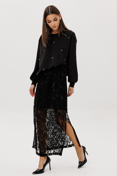 Стильный комплект, сочетающий уют и женственность. Мягкий свитшот из комфортного трикотажа украшен ручной расшивкой декоративными элементами в форме «клевера» — утончённая деталь, создающая акцент на естественной элегантности. Юбка выполнена из трендового шенилового гипюра с укороченной подкладкой, что придаёт образу лёгкость и современную многослойность.