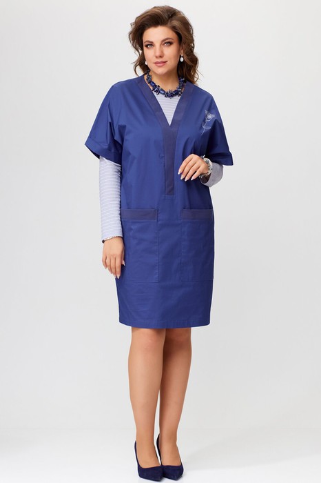 Женский комплект ВАРНА состоит из платья и лонгслива. Хлопковое женское платье прямого силуэта, зауженное к низу. Длина до середины колена. Рукав цельнокроенный, по низу рукава манжета с отворотом. По переду и середины спинки печать. Вырез горловины V-образный, оформлен притачными планками из трикотажного полотна. По переду выполнены накладные карманы с трикотажной планкой сверху. Лонгслив изготовлен из трикотажного полотна, прямого силуэта, рукав одношовный, втачной, низ обработан резинкой, горловина в лонгсливе обработана планкой, низ обработан на распошивалке. Комплект из платья и логслива идеально подойдет для городских прогулок и в гости.