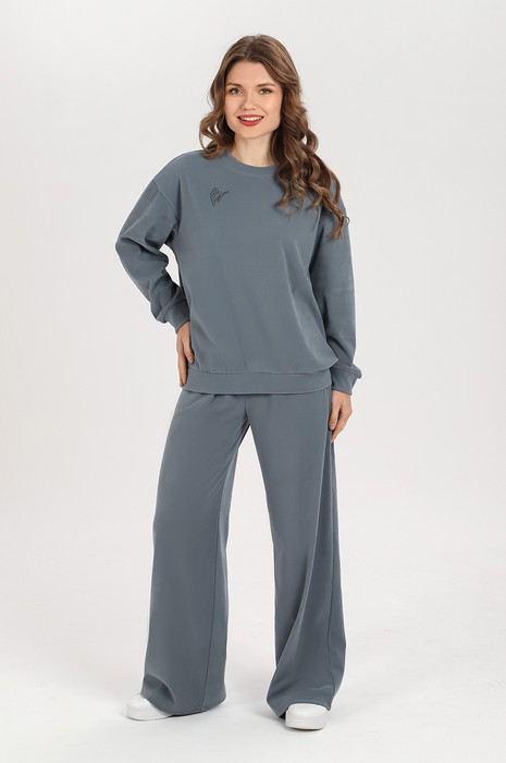 Костюм молодежный из гладкокрашеного трикотажного полотна «флис-сайкл», состоящий из джемпера и брюк. Джемпер – прямого силуэта, с длинными втачными рукавами, горловиной овальной формы, обработанной втачной планкой, притачным поясом понизу и принтом на полочке, выполненным в технике «шелкографии». Рукава – с притачными манжетами.Брюки – длинные, свободные, на притачном поясе с эластичной тесьмой внутри, карманами в боковых швах.