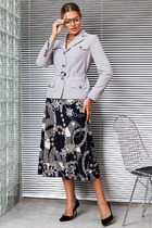 Костюм женский изготовлен из трикотажной ткани.Низ жакета, рукава и край борта обработан довязом. Жакет имеет v-образный вырез. Застёгивается на четыре петли пуговицы.