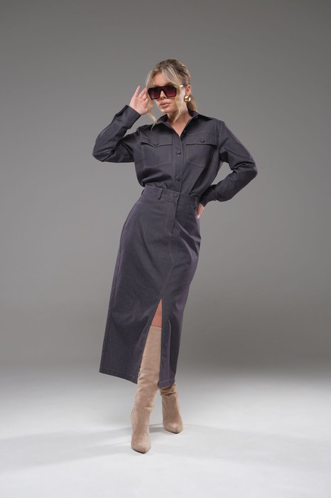 Костюм женский жакет+ юбка, изготовлен из джинса мягкой текстуры. На переде и обработана планка застёгивающаяся на пять пуговиц, накладной карман с клапанами идущий из линии кокетки. На переде обработана нагрудная вытачка идущая от бокового шва. Спинка с кокеткой. Рукава одношовные, заканчивающиеся манжетой. Воротник стояче отложной на стойке. Юбка  прямая с карманами, спереди застёгивающиеся на молнию. По поясу расположены шлевки.На переде обработан декоративный шов, заканчивающийся разрезом.