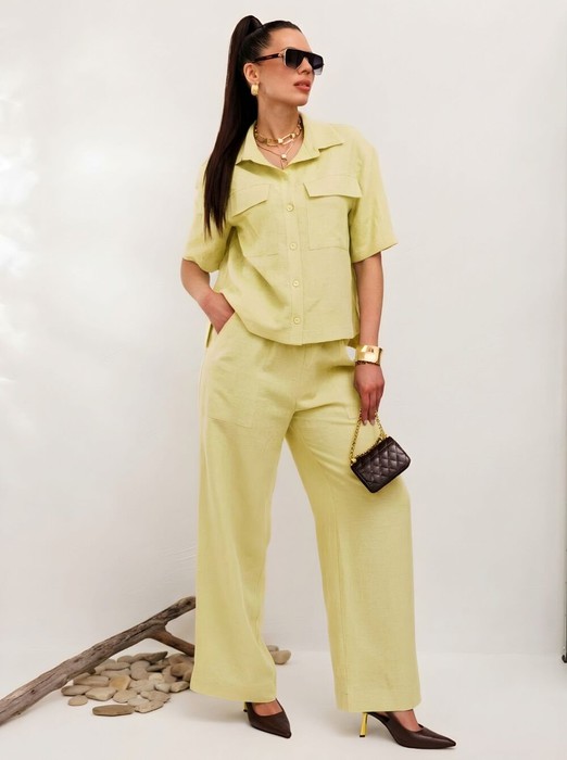 Льняной костюм двойка отличный выбор для женщин которые ценят комфорт и стиль.Этот комплект состоит из рубашки и брюк, идеально подходит для жарких дней. Рубашка прямого силуэта с воротником стойкой и застёжкой на петли и пуговицы. По переду имеются накладные карманы.