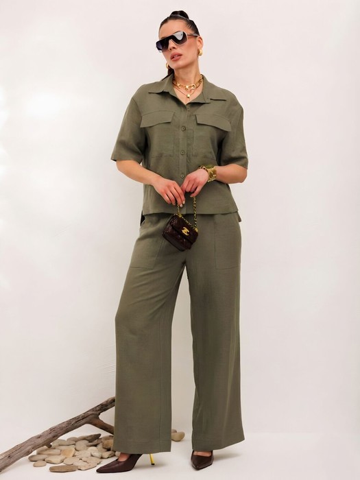 Льняной костюм двойка отличный выбор для женщин которые ценят комфорт и стиль.Этот комплект состоит из рубашки и брюк, идеально подходит для жарких дней. Рубашка прямого силуэта с воротником стойкой и застёжкой на петли и пуговицы. По переду имеются накладные карманы.