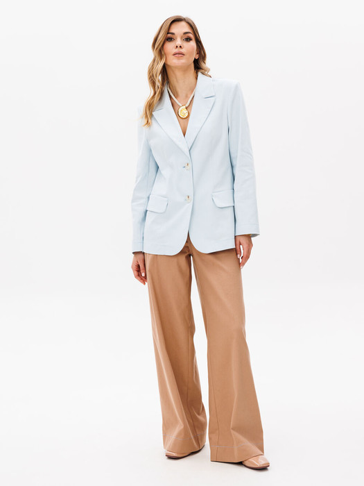 Костюм состоит из жакета и брюк из джинсовой хлопковой  ткани. Жакет полуприлегающего силуэта  с  воротником пиджачного типа.  Застежка однобортная на две пуговицы.  Перед с талиевой вытачкой, рельефом и декоративным клапаном. Спинка с рельефами из проймы и средним швом.  Рукав втачной двухшовный. Брюки расширеные книзу на притачном поясе. По поясу настрочены шлевки. По передним и задним частям брюк вытачки. На задних частях брюк настрочены карманы. Карманы, вытачки, пояс, низ брюк отделаны отделочной строчкой. Длина жакета - 68см, длина рукава жакета - 60 см, длина брюк с учетом пояса -107 см