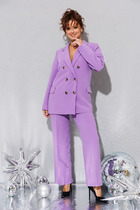 Костюм состоит из жилета и брюк, выполеных из костюмной ткани. Жилет полуприлегающего силуэта  с воротником пиджачного типа.  Перед с рельефами, талиевой вытачкой и декоративным клапаном.  Застежка центральная однобортная на 2 петли и пуговицы. Спинка со средним швом и рельефами. Вдоль оката рукава выполнена декоративная планка. К жилету прилагается тонкий пояс из основной ткани.  Брюки расширеные книзу с притачным поясом. Спереди застежка гульфик на молнии и с петлей и пуговицей по поясу. По задней частям брюк вытачки. В боковых швах карманы с наклонным входом. По поясу широкие шлевки. Брюки со срелками застроченными по переду и заутюженными сзади. Длина жилета - 71 см, длина брюк с учетом пояса - 109 см.