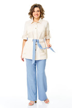 Джемпер прямого силуэта с воротником поло. Рукав втачной одношовный. По низу изделия, по низу рукава и по воротнику проложена отделочная строчка. Брюки расширеные книзу на притачном поясе. По поясу настрочены шлевки. По передним и задним частям брюк вытачки. На задних частях брюк настрочены карманы. Карманы, вытачки, пояс, низ брюк отделаны отделочной строчкой. Длина брюк с учетом пояса - 109 см, длина джемпера- 66 см, длина рукава - 30 см,