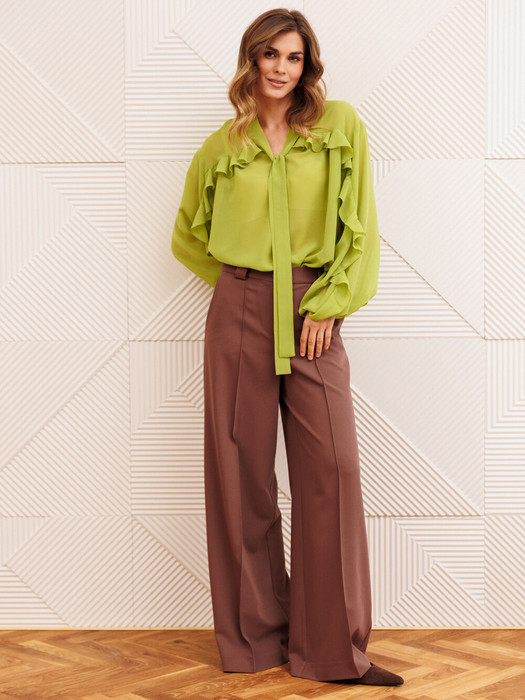Костюм состоит из блузки и брюк. Блузка свободного силуэта из струящейся шифоновой ткани. Перед и спинка с кокеткой и сборкой. Рукав спущенный свободный с резинкой понизу. Вдоль линии кокетки и рукава вставлена рюша. Горловина V-образной формы с воротником стойкой переходящей в бант.  Брюки палаццо с притачным поясом. Спереди застежка гульфик на молнии и петлей и пуговицей по поясу. По задней частям брюк вытачки. Пояс с резинкой в боковых частях. Брюки с заутюженными стрелками. Длина блузки - 67см, длина рукава - 60 см. Длина брюк с учетом пояса - 109 см.