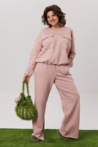 Костюм состоит из жакета и брюк из мягкой вельветовой ткани приятного цвета морского неба. Жакет полуприлегающего силуэта. Застежка однобортная на две пуговицы, воротник пиджачного типа. Перед с талиевой вытачкой, рельефом и декоративным клапаном. Спинка с рельефами из проймы и средним швом. Рукав втачной двухшовный. Жакет на подкладке. Брюки палаццо с притачным поясом . Спереди застежка гульфик на молнии и петлей и пуговицей по поясу. По задней частям брюк вытачки. Пояс с резинкой в боковых частях. Брюки с заутюженными стрелками. Длина жакета - 68 см, длина рукава жакета - 60 см. Длина брюк с учетом пояса - 109 см.