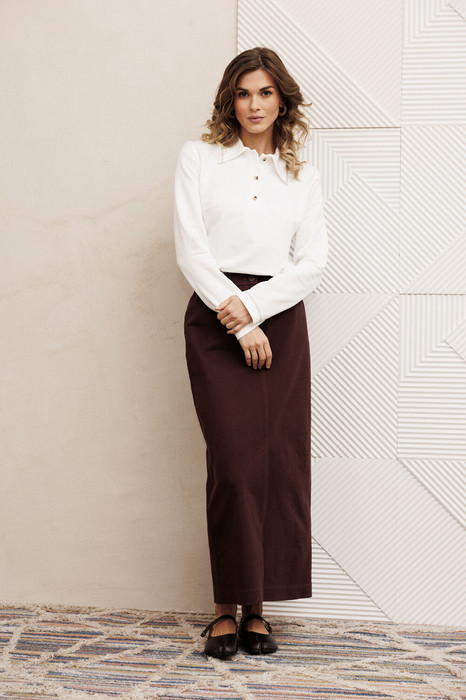 Костюм состоит из джемпера и юбки. Джемпер слегка приталенного силуэта с воротником поло из трикотажного полотна. Рукав втачной одношовный. Длина джемпера - 57 см, длина рукава - 60 см. Юбка прямого силуэта выполненная из джинсовой ткани. Передняя честь юбки с вытачками, со средним швом и застежкой гульфиком на молнии и щлицей спереди. Задняя часть юбки с вытачками. Юбка на притачном поясе с затежкой на петлю и пуговицу спереди и резинками по бокам. Длина юбки с учетом пояса - 90 см.