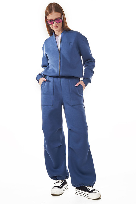 Современный комфортный костюм, состоит из брюк карго и укороченного бомбера. Отлично подойдёт для дома, прогулок, путешествий и отдыха. Пошит из теплой, комфортной ткани. Бомбер прямого силуэта, с застежкой молнией из металла. Горловина, манжеты рукавов выполнены из ткани-компаньона кошкорсе. На левом переде вышивка-логотип в цвет ткани. Бомбер с кулисой по низу с резинкой внутри и фиксаторами на боковых швах. Брюки расширенные к низу, с возможностью заузить и зафиксировать ширину внизу (низ имеет кулиску с резинкой и фиксатором). На передних половинках брюк удобные накладные карманы, складки в районе линии колен. Пояс из ткани компаньена кошкорсе со шнуром и резинкой внутри.