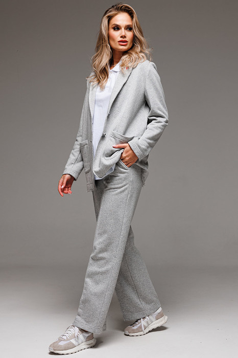 Костюм Gowear из футера в стиле smart casual поможет создать в меру строгий и одновременно расслабленный образ. Костюм состоит из жакета и прямых брюк. Жакет прямого силуэта с воротником и лацканами, имеет удобные карманы и застежку на 2 пуговицы. На левом лацкане вышивка-логотип в контрастном цвете. Низ и борта имеют открытые края (эффект необработанного шва), укреплены дополнительной строчкой. Жакет без подкладки. Брюки прямые. На передних половинках - отделочная строчка по стрелкам и удобные боковые карманы. Пояс из ткани кошкорсе, с резинкой и контрастным шнурком.