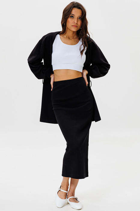 Костюм Gowear из футера в стиле smart casual поможет создать в меру строгий и одновременно расслабленный образ. Костюм состоит из жакета и юбки из эластичной ткани кошкорсе. Жакет прямого силуэт, с v-образным вырезом горловины, без застежки, с отдельным поясом. На левом переде вышивка-логотип в цвет ткани. Рукав свободный, со складками, присобран на манжету. Жакет без подкладки. Юбка прямая, облегающая фигуру с разрезом на спинке. Пояс цельнокроенный с резинкой внутри.