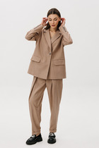Туника с центральной застежкой на петли и пуговицы, втачным воротником с отрезной стойкой. Плечо спущенное, рукав втачной, длинный, с отрезной манжетой. Спинка с отрезной кокеткой, по шву притачивания кокетки- бантовая складка. На боковых швах расположены шлевки для декоративного пояса. Пояс может фиксироваться в петле по борту правой полочки. Низ туники фигурный, с притачной деталью- бахромой. Брюки с отрезным поясом. Передние половинки с карманами, вход в карман наклонный к боковому шву. Пояс присборен на резинку. По низу брюк притачная деталь с бахромой.