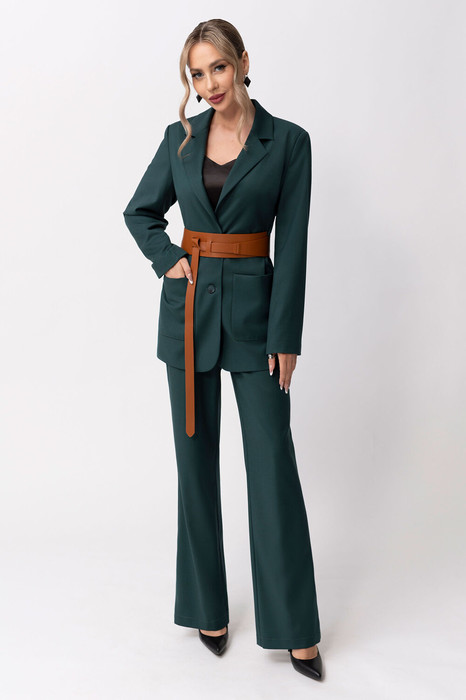 Жакет с центральной застежкой на петли и пуговицы, втачным воротником и отложным лацканом пиджачного типа. По переду нагрудные вытачки и накладные карманы. Спинка со средним швом. Брюки- с отрезным поясом, на поясе расположены шлевки. По спинке пояс присборен на резинку. По боковым швам расположены карманы. Вход в карман наклонный к боковому шву. По передним половинкам, по шву притачивания пояса- односторонние складки. Застежка гульфик. Комплект со съемным поясом.