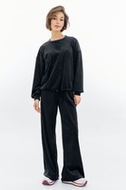 Блузон с высоким отрезным воротником- хомут. По переду с отрезной V- образной кокеткой. Спинка цельная. По низу блузона- кулиса со шнуром. Рукав втачной, длинный Плечо- спущенное. Брюки прямые, с отрезным поясом. Пояс присборен на резинку. В боковых швах расположены карманы.