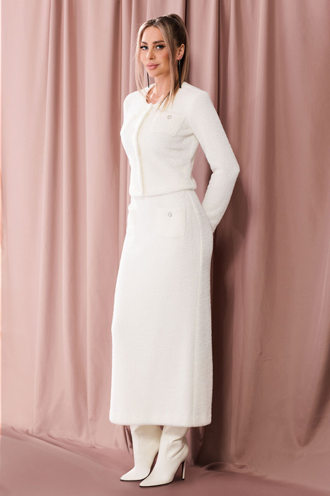 Жакет, без воротника, с круглым вырезом горловины, центральной застежкой на петли и пуговицы. По переду с нагрудными вытачками и накладными карманами на уровне груди. По спинке с талиевыми вытачками. Рукав втачной, длинный. Юбка без пояса, по верхнему срезу юбки- резинка. На уровне линии бедер- накладные карманы. Заднее полотнище юбки со средним швом, заканчивающимся щлицей.