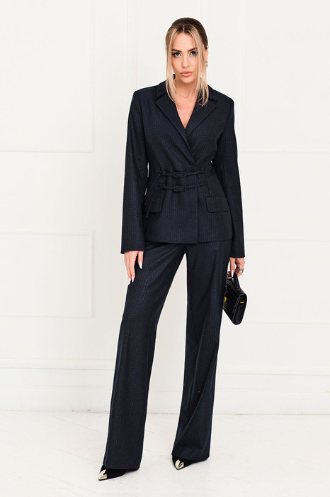 Жакет с центральной застежкой на петли и пуговицы, втачным воротником и лацканом пиджачного типа. По переду с талиевыми и нагрудными вытачками. На уровне линии бедер расположены прорезные карманы с листочкой и клапаном. Из талиевых вытачек выходят пояски с пряжками. По спинке со средним швом, талиевыми вытачками. Рукав втачной, длинный. Брюки- с отрезным поясом со шлевками, застежка- гульфик, верх брюк в области спинки присборен на резинку. По боковым швам расположены карманы. Вход в карман наклонный к боковому шву.