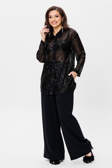 Рубашка свободного силуэта, воротник рубашечного типа (без стойки), рукав втачной спущенный на манжете по низу. Застежка на петли-пуговицы по переду.