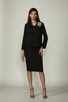 Женский костюм, состоящий из джемпера и юбки, выполнен из мягкого трикотажа, который держит форму. Джемпер свободного силуэта с цельнокроенными рукавами и застежкой-молнией по спинке. Джемпер дополнен дизайнерской вышивкой по переду и спинке. Классическая юбка-карандаш на трикотажной подкладке с завышенной линией талии, на обтачке, застегивается на молнию и имеет сзади шлицу.