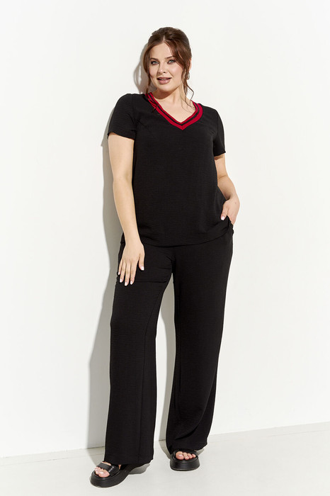 Костюм женский, состоящий из туники и брюк, выполнен из легкой струщейся ткани. Туника свободного силуэта со втачными рукавами; линия горловины с V-образным вырезом и контрастным довязом. Брюки классические, прямого кроя, в боковых швах функциональные карманы, пояс притачной полностью на резинке. Костюм полностью соответсвтует заявленному размеру. Пользуйтесь таблицей замеров готового изделия.