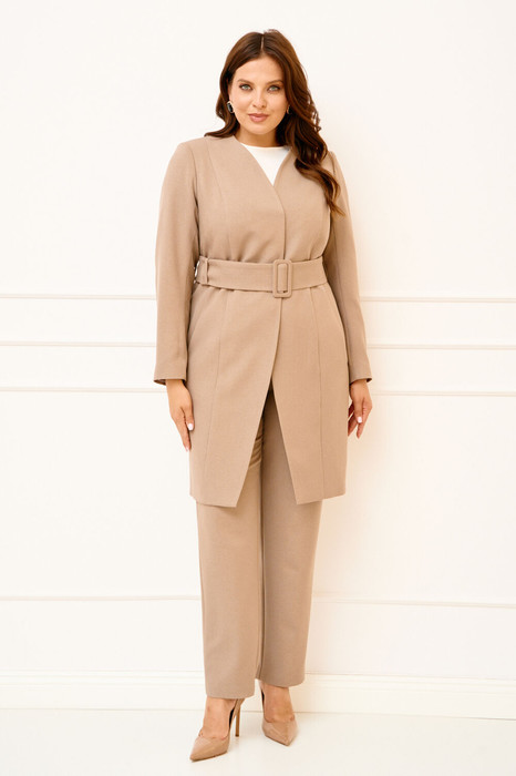 Костюм женский, состоящий из удлиненного жакета и брюк, выполнен из плотной костюмной ткани. Жакет на подкладке полуприлегающего силуэта до линии колена; рукава втачные; горловина V- образной формы; по переду рельефы и функциональные прорезные карманы; застежка на потайные пришивные кнопки. Зауженные к низу брюки полуприлегающего силуэта застегиваются на молнию, петлю и пуговицу; пояс притачной с резинками в боковых швах для лучшего прилегания; на передних половинках функциональные карманы. В комплекте съемный пояс из основной ткани. Костюм полностью соответсвует заявленному размеру. Пользуйтесь таблицей замеров готового изделия.