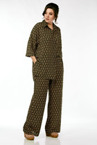Комплект брючный 2-х предметный изготовлен из трикотажного полотна. Джемпер свободного силуэта, горловина обработана воротником – стойка. Низ переда с широкой планкой, декорированной печатью. Спинка цельнокроенная. В боковых швах обработаны карманы. Рукав спущенный, длинный. Брюки средней посадки, пояс на резинке дополнен шнуром. Брюки прямого покроя.