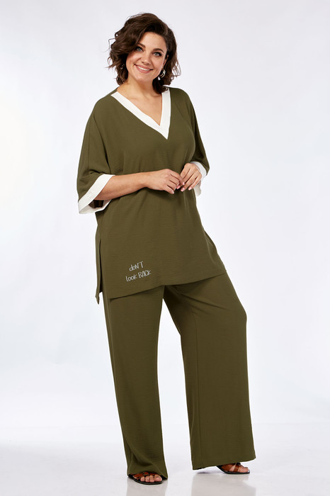 Комплект брючный, состоит из туники и брюк. Туника свободного силуэта из костюмно — плательной ткани. Горловина V — образной формы. По низу рукава и горловине вставлен довяз. Рукава — цельнокроеные. В боковых швах внизу блузы обработаны разрезы. Брюки средней посадки, прямые. Пояс на резинке обработаны боковые карманы. Декор — печать по низу туники.