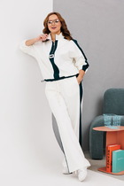 Комплект брючный 3-х предметный состоит из жилета, брюк и джемпера. Жилет из костюмно-плательной ткани прямого силуэта. Горловина V-образной формы. По переду фигурные кокетки, рельефные швы.  Застежка центрально — бортовая на петли и пуговицы. Спинка разрезная с кокеткой. По боковым швам разрезы. На плечевых швах паты с пуговицей. Брюки средней посадки, заужены к низу. По переду боковые карманы с подрезным бочком. По задним деталям накладные карманы. Пояс в 58-62 размере частично на резинке. Джемпер из трикотажного полотна. Рукав спущенный. По переду печать.