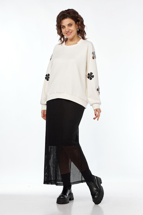 Комплект женский юбочный, состоит из джемпера и юбки. Джемпер свободного силуэта выполнен из трикотажного полотна. Горловина фигурной формы. Рукава — реглан, декорированы вышивкой с отлетными цветочками из органзы и искусственной кожи. По низу рукавов манжеты. Джемпер с фигурной линией низа. Юбка зауженная к низу из ажурного трикотажного полотна на подкладке. Сзади-разрез. Юбка с поясом на резинке.
